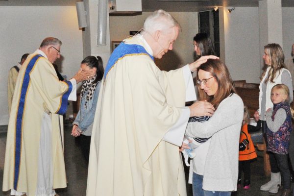Father Michael Field, pastor of Saint Bridget University Parish, Glassboro, blesses Jamie Giambanis and her son, George, at