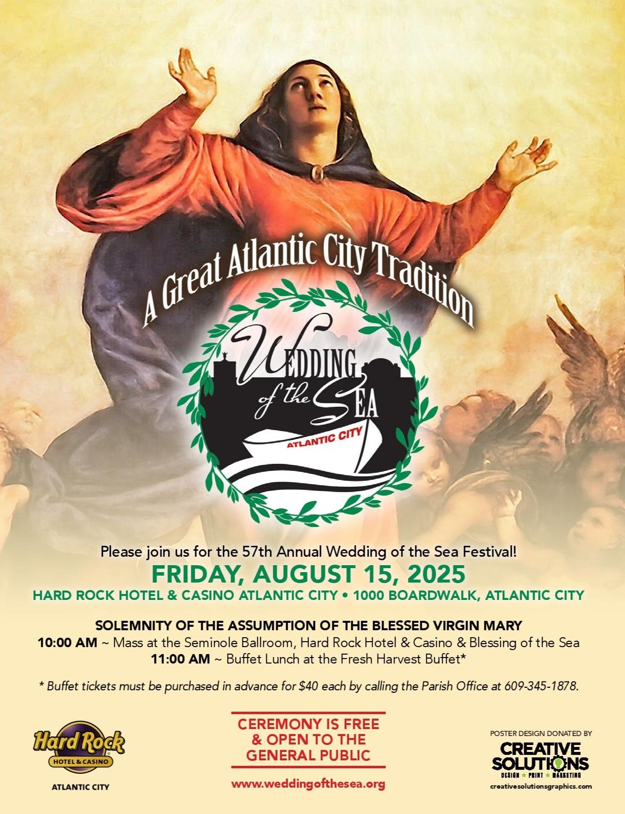 At 10 a.m. on Friday, Aug. 15, the Bishop Joseph Williams will celebrate Mass on the Solemnity of the Assumption of the Blessed Virgin Mary in Hard Rock Hotel & Casino’s Seminole Ballroom – 1000 Boardwalk, Atlantic City – with the Parish of Saint Monica. Following the Mass, a procession will begin on Pennsylvania Avenue and proceed to the beach for the Wedding of the Sea ceremony. The parish is inviting all to attend a luncheon at the Hard Rock’s Harvest Buffet after the Blessing of the Sea. For more information, and to purchase tickets for the luncheon, go to accatholic.org.